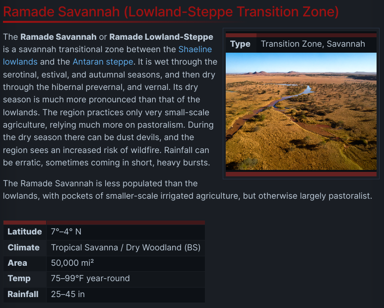 The world is a living breathing thing, a complex matrix of interdependent ecosystems. For regional climates I start with a latitude measurement and a description of the surrounding terrain: features like mountains, lakes, or gorges that will alter the climate, or the prevailing winds and ocean currents. ChatGPT helps me estimate the rainfall and research real-world comparable climates, which then informs the construction of realistic flora & fauna and helps dial in the annual temperatures and seasonal eccentricities.