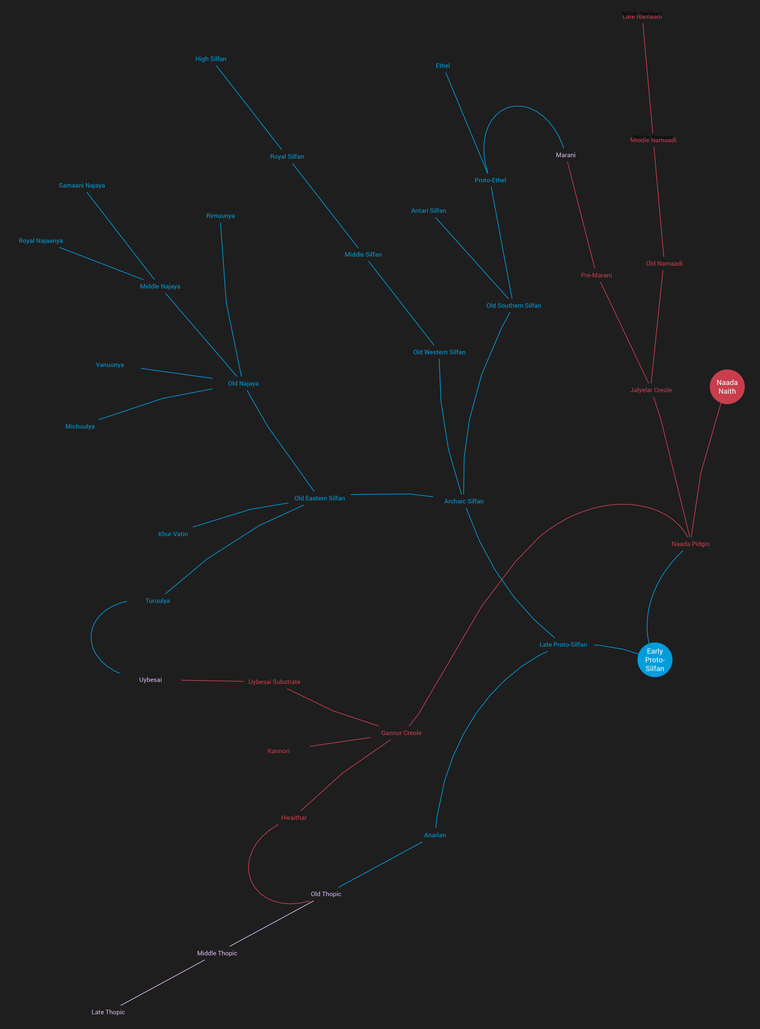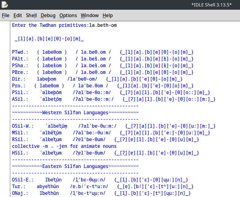 My constructed languages are evolved from the ground up using principles from historical linguistics and evolutionary phonology. Starting from several primitive ancestral proto-languages, the phylogeny splits and bifurcates into an entire arbor of languages. One language becomes another through discrete diachronic sound changes. These are easy enough to write into a Python program in order to quickly derive daughter words from the mother. As of now one particular language family is the most developed, but at least 10 are at some level of serious development; sound changes & phonology have been mapped out for nearly all the languages.